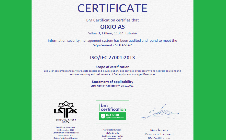 Alates 2021. aasta detsembrist vastavad OIXIO kõik protsessid ISO27001 standarditele.
