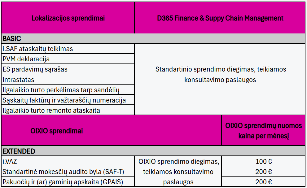 D365 F&SCM lokalizacija pateikiama paties Microsoft, tačiau atsižvelgiant į jos apimtį OIXIO klientams siūlo papildomus lokalizacijos plėtinius, kurie padengia papildomus reikalavimus sistemos lokalizacijai.