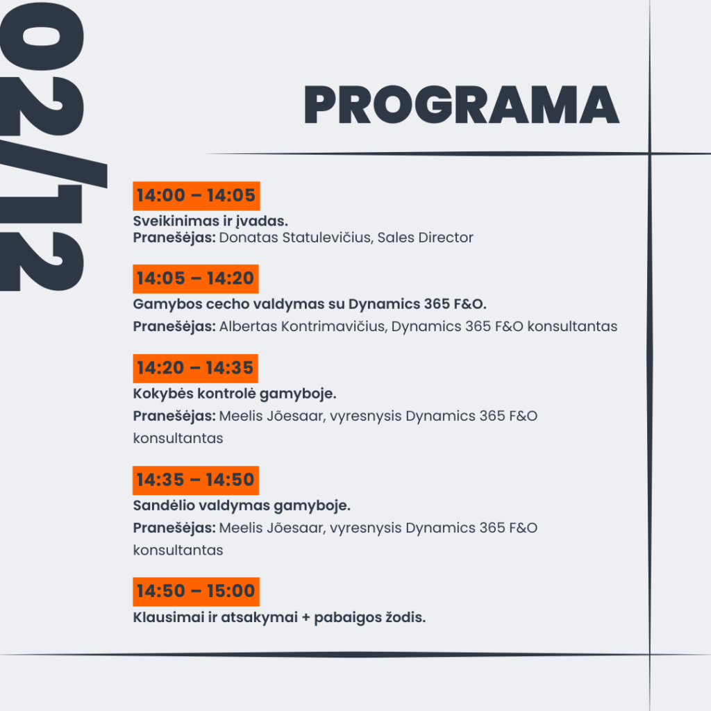Vebinaras skirtas gamybos, operacijų, logistikos ir IT vadovams, taip pat Dynamics 365 ir ERP sprendimų priėmėjams, norintiems geriau suprasti, kaip palaikyti kasdienę gamybos veiklą.